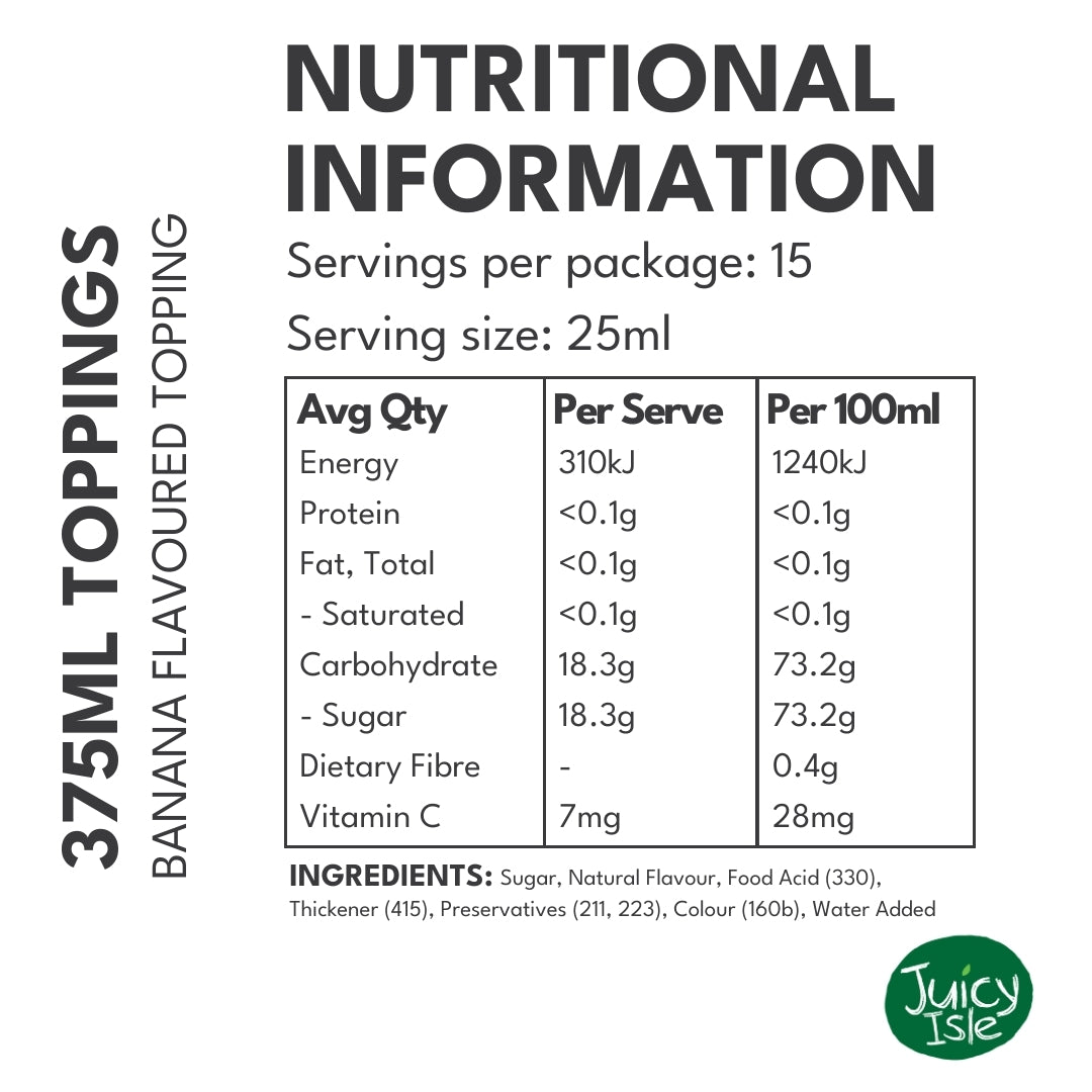 Add a burst of delicious fruity flavour to your favourite desserts and sweet treats with Juicy Isle's Banana Flavoured Dessert Toppings.